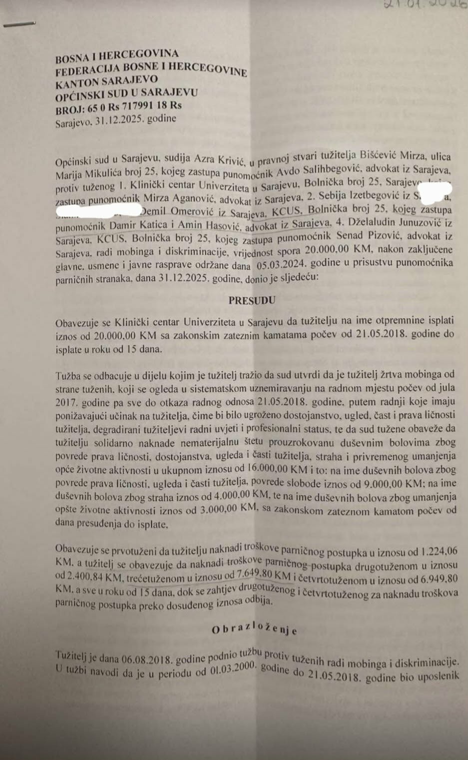 Općinski sud u Sarajevu, je 31. 12. 2025. godine u pravnoj stvari tužitelja Mirze Biščevića, protiv tuženih 1. KCUS-a, 2. Sebije Izetbegović, 3. Đemila Omerovića, 4. Dželaludina Junuzovića, donio nepravomoćnu presudu, kojim je obavezao KCUS, da tužitelju na ime otpremnine isplati 20 hiljada maraka sa zakonskim zateznim kamatama, počev od 21. 05. 2018. godine do isplate u roku od 15 dana.